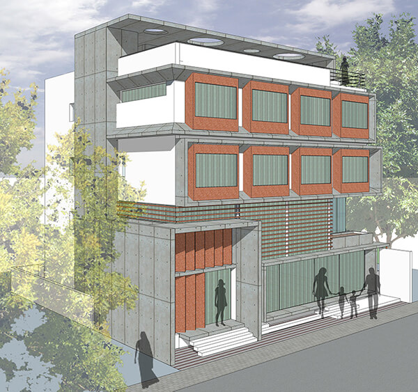 The façade is expressed as an exploration of form representing the program inside the building. The form finished R.C.C. entrance portal surfaces out of the form and welcoming visitors. A similar separate entrance has been designed exclusively for the restaurant to generate more footfall. On the upper floors, the rooms have their own carved out niche windows which becomes a seater and provides protection against the elements. The design of this reminiscent of the “jharokha” from traditional Indian architecture.