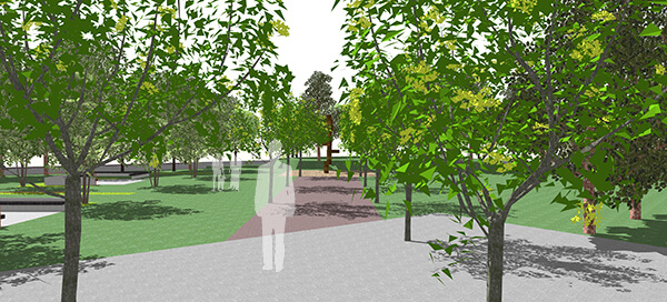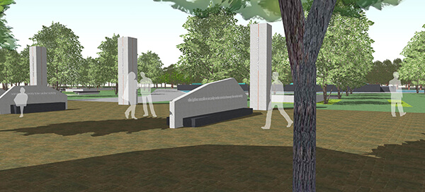 The design approach was laid out as a contemplative walk along the axis from the circle to the centre where the large sculpturesque obelisks were placed and walk continuing to the other end of the site. The idea being the site is not a destination but a part of the activity of people coming to the area. The first part of this walk begins from a pedestrian entry plaza located at the circle. Sculpturesque seaters aligned with granite cladded detailed obelisks were designed demarcating the boundary of the paved plaza and entry to the memorial garden. The intermediate commemorative walk in the memorial garden consists of walls etched with memories of the police martyrs along with spread out seating. The destination is the group of monumental sculptures juxtaposed in the centre of a water body etching a memory of the martyrs.